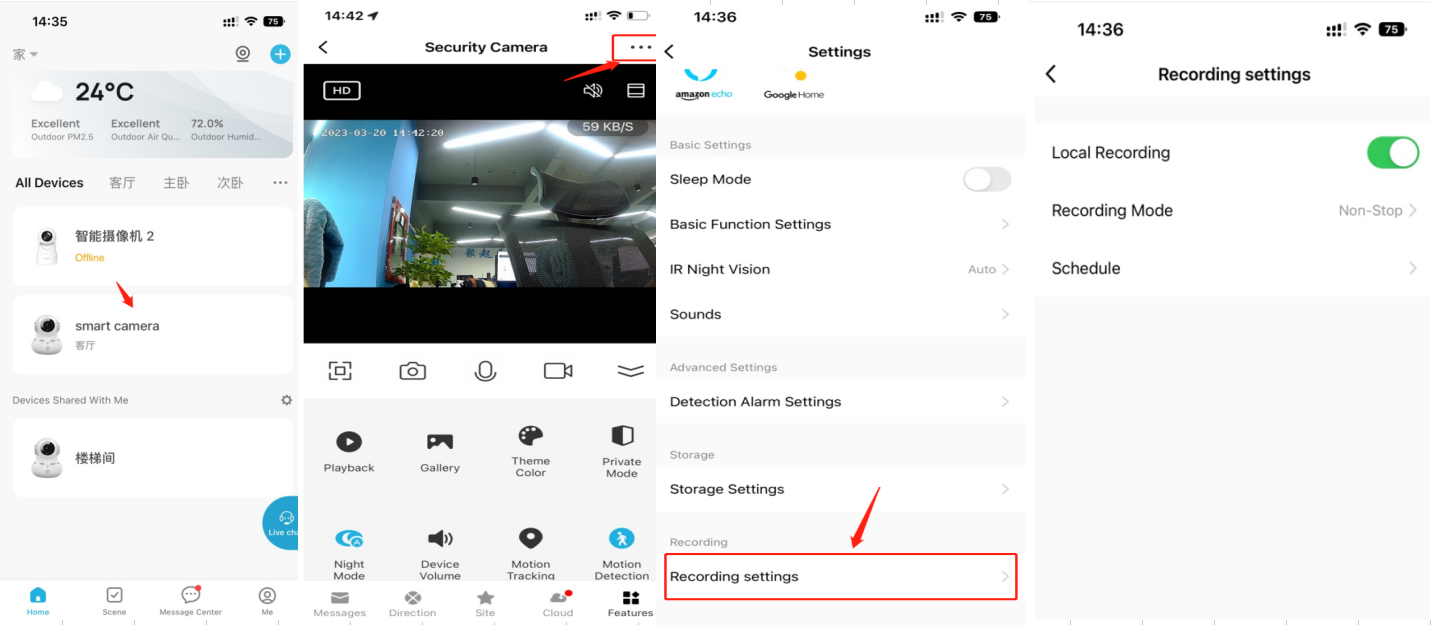 We offer two recording options: for local SD card storage, you can choose between continuous recording and scheduled recording. For cloud storage, only one subscription supports continuous recording, while others support event-based recording. For more information, please contact our service center.
